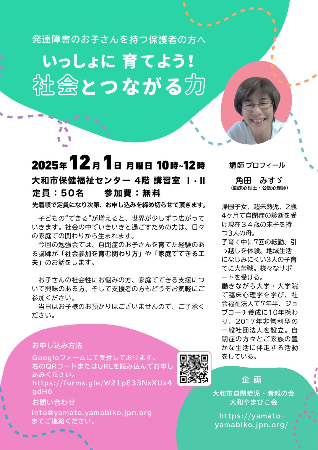勉強会 発達障害のお子さんを持つ保護者の方へ「いっしょに育てよう! 社会とつながる力」